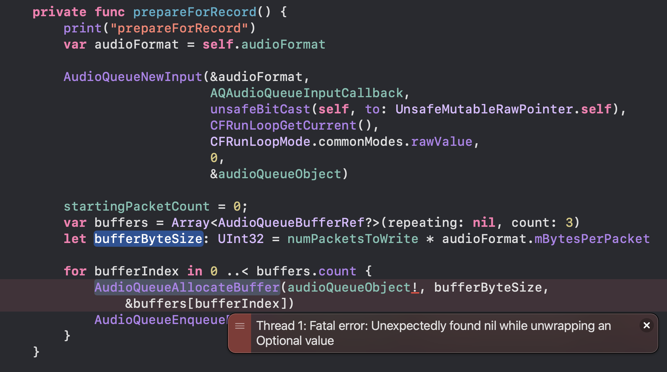 Changing the underline of the picture to the format "kAudioFileWAVEType" causes the queue to throw a fatal error: (refer to photo 2)